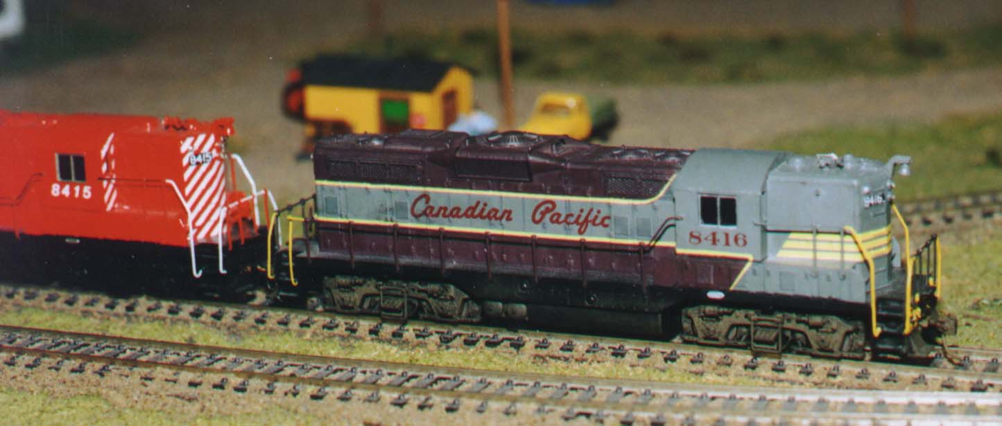 I saw CN Geeps before I saw CP Geeps, and when I saw CP units in action for the very first time I thought they were running backwards. Oh well, I'm not tempted to put things right when I run my locos. CP GP-7s are easy to model. Bells, horns, radio antennae, and that's it. If you notice the Action Red unit has stripes on the face of the cab. I don't ever remember seeing a CP Action Red Geep with five inch stripes that didn't have them on the front of the cab. Yet I've seen factory painted models of CP Geeps without the stripes. Someone messed up somewhere. As for the Script unit, the Tuscan Red is way off, but it was my first attempt at mixing this colour. I now know better. Use a brand of paint that comes in CP maroon. The yellow striping in the C-D-S Script and Block CP decal sets is a little on the light side, and it was an afterthought to try and match the paint on the pilots and handrails. I did on 7068 and 8905. Lots of trial and error in this hobby.