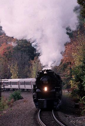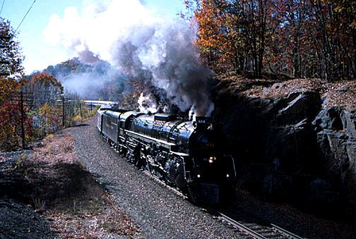 The 4-8-4 was romping and stomping westbound at Tuxedo Rocks north of Tuxedo, New York, on October 18, 1997.