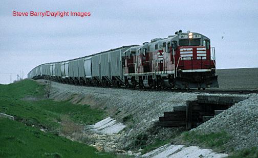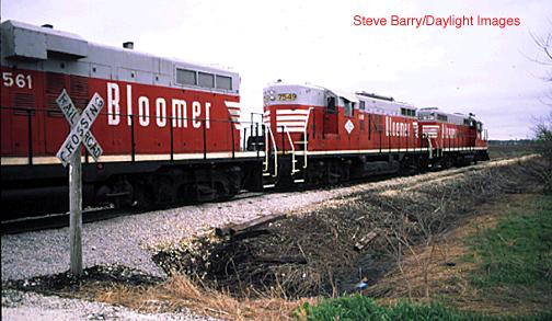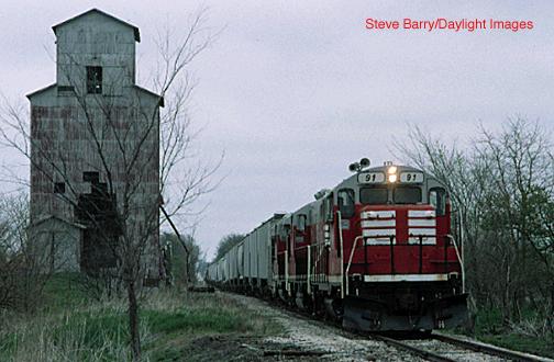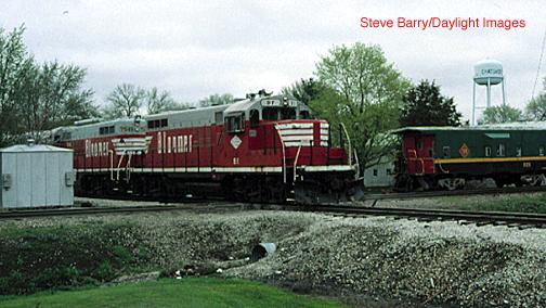 At Chatsworth, the Bloomer crosses the Toledo, Peoria & Western. The TP&W caboose on the right is on display. At one time the Bloomer kept its locomotives in Chatsworth, but now maintenance is done at Gibson City.