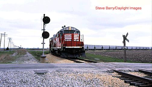 The Bloomer at Risk (that's the name of the town) -- From Saxony (just north of Cullom where our chase began) to Risk the Bloomer operates over former Illinois Central trackage. At Risk the IC crossed the Wabash on a diamond. Today the Bloomer serves the IC beyond Risk as far aas Colfax and the Wabash to Gibson City. Here the train is swinging onto the former Wabash. The Wabash is abandoned north of here, and the signal protected the Wabash at the IC diamond.