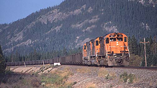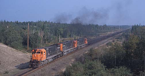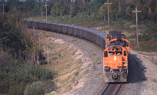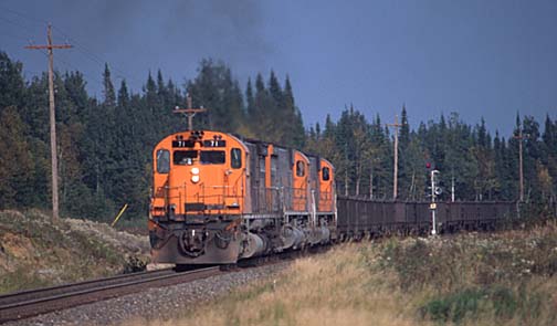 My first day on the Cartier was September 10, 2001. I headed north from Port Cartier to scout out the photo locations along the dirt provincial park road that roughly follows the track into the wilderness. Near Baker siding, about 25 miles north of Port Cartier, I encountered my first train, a southbound with M636 No.82 on the point.