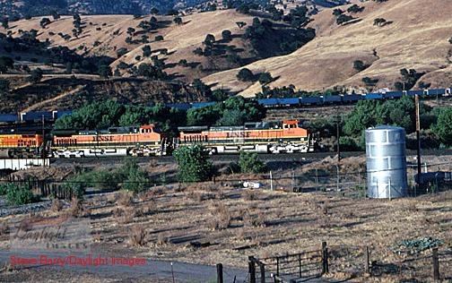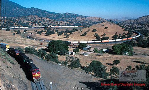 Early in the morning on June 30, 1999, Burlington Northern & Santa Fe Dash 9-44CW's 1023 and 1119 lead a train through the Caliente horseshoe curve toward Bakersfield.