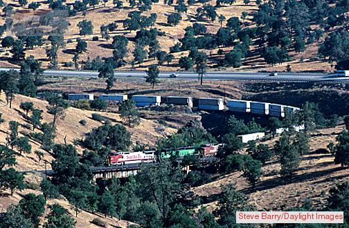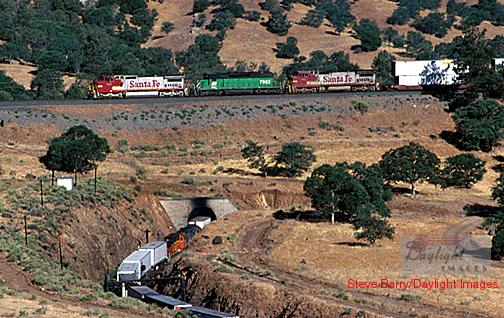 We conclude our look at Tehachapi by watching a long trailer train negotiate the famed loop from a vantage point on top Tunnel 10. We see Santa Fe Dash 8-40CW 897 with its train double back on itself in the valley as it makes its approach to Tunnel 9.
