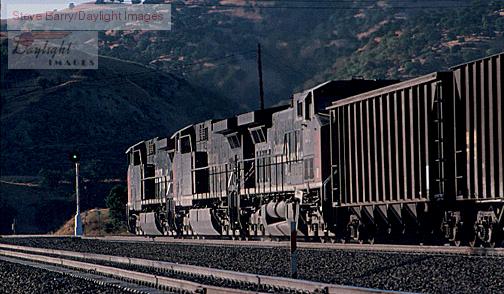 A trio of Southern Pacific AC4400CW's lead a beet train uphill toward a green signal at Bealville.