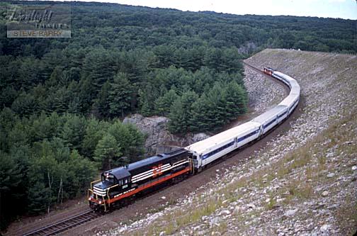 Day Two of the Convention was hosted by the Naugatuck Railroad located just outside Waterbury, Connecticut. The Naugy boasts a fine collection of New England diesels. One of the locomotives in the collection is GP9 No.1732, lettered for the Naugy but painted in a Boston & Maine scheme. The Geep sits in Thomaston awaiting the arrival of the Convention train.