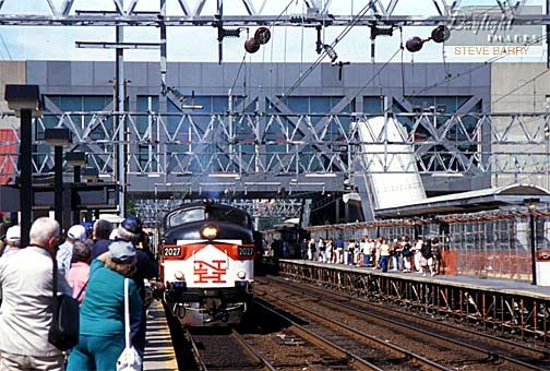 The Convention proved to be a celebration of New Haven heritage. Convention-goers attempt to photograph an FL9 owned by Connecticut Department of Transportation and painted in full McGinnis-era New Haven paint as it arrives at the Stamford station on July 13, 2000.
