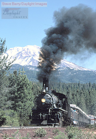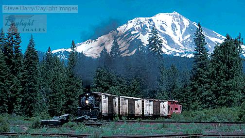 On June 21st, conventioneers were bussed to McCloud, California, for a trip the following day on the McCloud Railway. Outside of McCloud, 2-6-2 No.25 put on an impressive display hauling the excursion train under Mount Shasta.