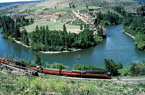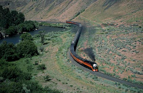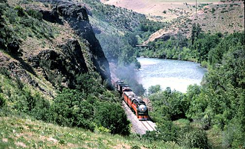 One of the highlights of the trip was the passage through the Yakima Canyon between Ellensburg and Cle Elum on June 15, 1997. Looking down, we see the train at Wymer.