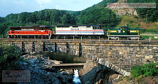 As evening approaches, it's time to shuffle equipment in Green Mountain's Bellows Falls yard for the night photo session. Claremont & Concord 44-Tonner No.30 is pressed into service as "yard goat," leading Amtrak F40PH 226 and Providence & Worcester B23-7 2215 onto the classic stone arch bridge between Bellows Falls and North Walpole, New Hampshire.