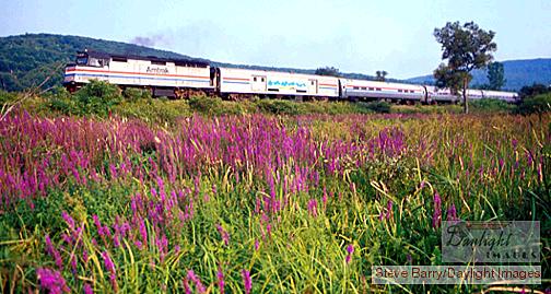 Early evening is also when the northbound Vermonter shows up. Amtrak F40PH 291 leads the train past a small swamp full of purple flowers just south of Charlestown, New Hampshire.