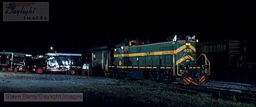 Following the fireworks, a more traditional night photo session takes place. First up is Rutland RS1 405 with a vintage passenger train and Mark Player's Railway Express Agency trucks at the Bellows Falls depot.