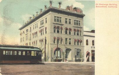 An interurban car passing the Oil Exchange Building, Bakersfield.