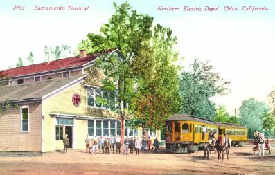 Here is a train of the Northern Electric, predecessor to the Sacramento Northern, at Chico, made up of two lovely arch-roof interurban cars.