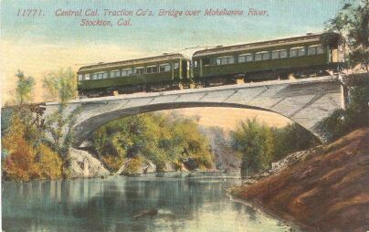 Two-car interurban train of the Central California Traction Co., crossing the Mokelumne River in Stockton.