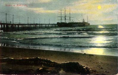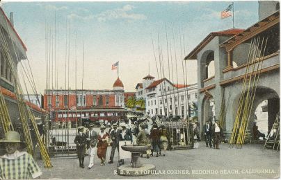 The next card shows a pier at Redondo Beach. A period map shows several wharves served by railroads at Redondo; note that this one has overhead wires, so it must have had PE tracks on it.