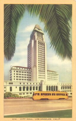 A classic view of Los Angeles city hall with a L.A. Railways "yellow car" PCC streetcar in the foreground.