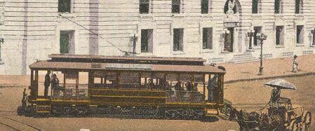 An early view of an LA city car, in front of the Post Office/Federal building-- whose price (assumedly large for the time) of a million and a half is noted. This is a nice view of a typical early day California-type car on the "yellow car" system, seen close up below: