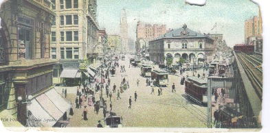 Another Manhattan scene, an elevated railway and many streetcars; note the cable-car-like slot between the rails for the conduit collection system.