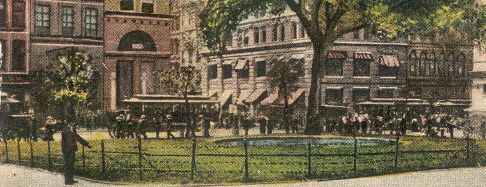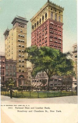 A card showing "National Shoe and Leather Bank" Building, Broadway and Chambers, New York, viewed from across City Hall Park. Note that the streetcars (see closeup below) do not have trolley poles, since Manhattan streetcar lines used an underground conduit collection system.