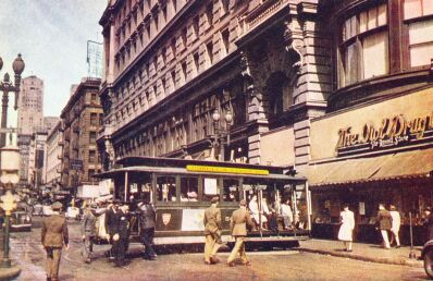 Here is a better view of one of the Market St. Ry.'s (note their characteristic shield-shaped emblem) Powell St. cable cars. Judging by the automobiles and overall environment, not to mention the foreground figures in uniform, this picture appears to be from not long before the ultimate merger of the MSRy into the Muni during WWII.