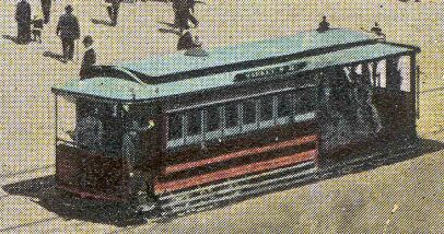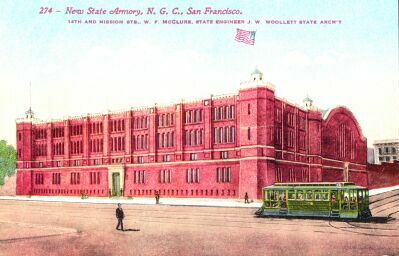 Some of the Market Street Railway's most important lines ran on the City's other major thoroughfare, Mission Streetthe successor to the 14 Mission car line, Muni's 14 Mission trolleybus, has been called the most heavily used bus line in the world (and having ridden it many years, I belive it!). In this card, the National Guard Armory at Mission and 14th St. is the background for a classically San Francisco early-day car: