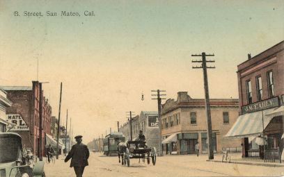 The farthest flung branch of the San Francisco streetcar system was the Market St. Railway/United Railroad's 40 line to San Mateo. Here, one of the heavy interurban cars used in the early days of the line, and known locally as "big subs", trundles through downtown San Mateo.