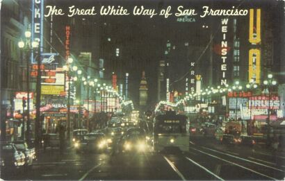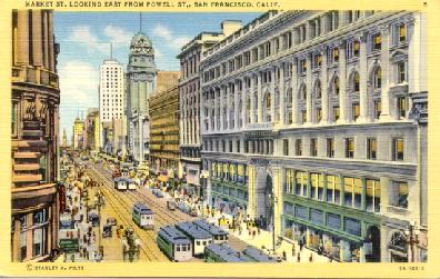 Here's a more recent view (60's or 70's) of Market Street, featuring one of Muni's PCC cars in the "green and cream" livery.