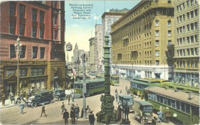 The corner of Market, Kearney, and Geary, with Lotta's Fountain in the foreground, the Palace Hotel to the right, and a plethora of Muni and Market Street Ry. streetcars.