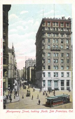 In an earlier, pre-earthquake view, a cable car works its way along Market Street, passing Montgomery Street, "the Wall Street of the West".