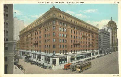 Another view featuring the Palace Hotel, and from front to back, a Market Street Ry streetcar, a Muni Car, and an early bus: