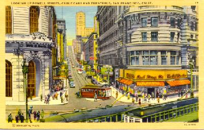 Here are two views from the same location, the corner of Powell and Market Streets. Visible in the first view, which looks down towards the ferry building, are the famous four tracks of Market Street whose steady stream of streetcars was for decades known to locals as "the roar of the four".