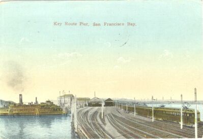 This card shows the Key System's Oakland pier, with an interurban train on its way to a ferry connection.