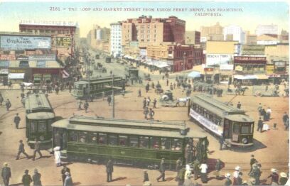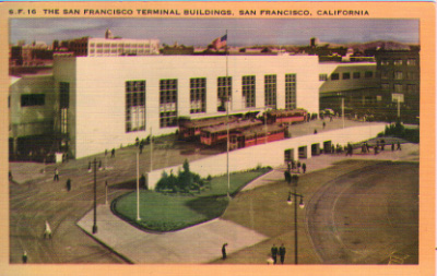 Here's the Transbay terminal. Postcards in this era were basically colorized black-and-white photos, and it seems pretty clear that the artist who colorized this shot was not a native of the City, since red is definitely not the correct livery for these cars.