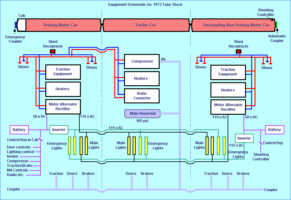 The 1973 Stock is arranged so that each 3-car unit is self contained. If it is a double-ended unit, it can be driven from either end. The general arrangement of the equipment is shown in the diagram below. On the double-ended units, a Driving Motor Car is used in place of the UNDM.