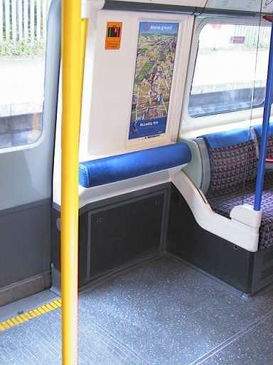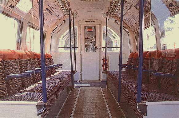 Although the cars were longer than the traditional Underground design, the arrangement of doorways was the same. This is because the small body profile required by tube tunnels restricts the floor height. This in turn requires that the wheels intrude into the underframe construction over the bogies. Doors cannot be located at these positions so the openings for the wheels are covered by longitudinal seats. Each car has four doorways on each side with a single leaf sliding door at each end and two double doorways between. The doorway opening is the standard 1372mm (4ft 6ins).