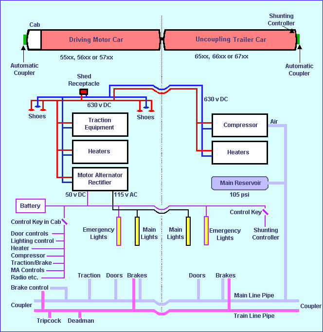 Each motor car has a motor alternator (MA) providing 230 volts AC at 850Hz for auxiliary services. The output is stepped down to 60 volts AC for the battery charger and to 115 volts AC for the main car lighting. The 60 volt AC rectifier output recharges the battery on each motor car at 50 volts DC and supplies the control circuits at that voltage. The basic system is shown in the diagram Fig 13 below.