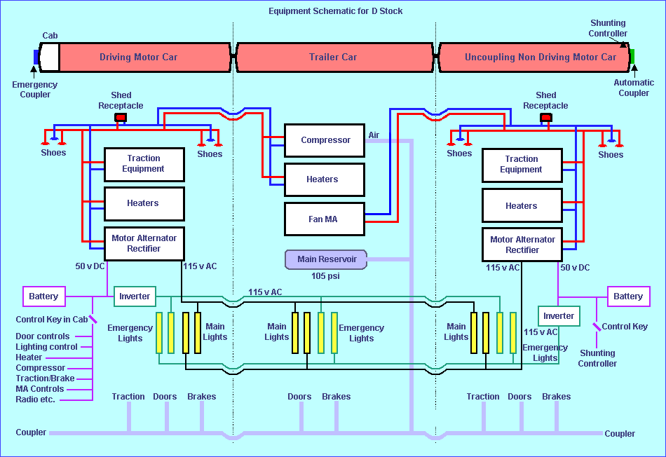 Each motor car has a motor alternator (MA) providing 230 volts AC at 850Hz for auxiliary services. The two MAs on a 3-car unit supply half the lighting on the unit, arranged so that all the lights down one side of the train are fed from one end and the other half from the other end. This means that only 50% of the car lights are lost when the motor car supplying the MA passes over a current rail gap. The MA recharges the battery on each motor car at 50 volts DC and supplies the control circuits at that voltage. The D Stock also has an additional motor alternator supplying 230 volts at 50Hz for the unit's saloon ventilation fans. This machine is mounted under the trailer car and runs when required by the temperature setting of the ventilation equipment.
