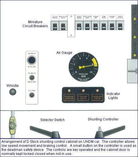 At the outer end of each UNDM car, there is a shunting control cabinet which is used to allow the unit to be driven from the non-driving end at reduced speed in the depot. The cabinet contains a set of miniaturised controls for selection of direction speed and braking. There is also a whistle and an air gauge. The cabinet is normally kept locked behind a panel on the left side of the car end panel.