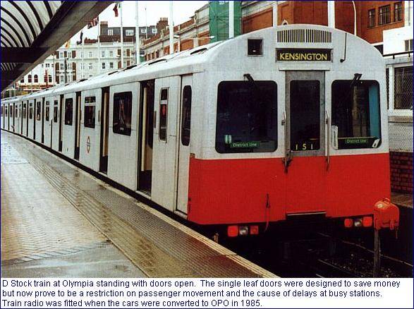 3-car D Stock double-ended units provided the service on the East London Line between April 1985 and May 1987. They became available because of the reductions in service introduced all over the Underground in the mid-1980s. Their use on the ELL allowed the release of A Stock for conversion to OPO. The D Stock was also converted at this time and the units on the ELL began OPO in service from May 1985.