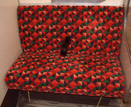 Since February 2002, more and more D Stock trains have been appearing in service with a new moquette. It looks to Tubeprune as if it was designed by a pizza chef. What do you think? Photos by District Dave.