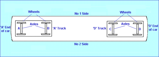 The identification system was based on the car axles and wheels. Each car has four axles, lettered A, B, C, and D. The car end nearest the A axle is called the "A" end and the other end, near the D axle, is termed the "D" end. This system ensures that the units are correctly orientated for coupling. The following drawing shows how the identification works.