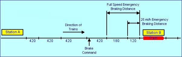 In order to understand how the ATO signalling system works, it is necessary to mention the need for a safe braking distance. If a train travelling at (say) 40 mi/h is tripped, it will travel about 600 feet (200 m) before coming to rest. So, to ensure safety for the train, it must be stopped before it can enter an occupied block. The way to do this is to trip the train if it enters the block before the occupied one. Such a section is called the "overlap" and its length will be at least that required for a train to come to rest from maximum possible speed.
