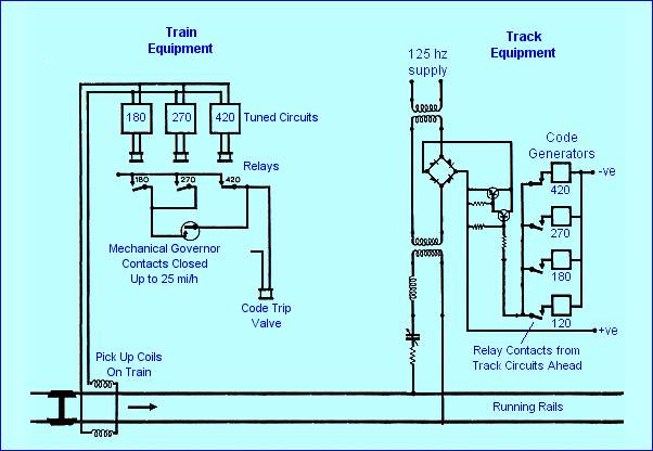 | 120 pulses per minute | Not detected by the train. Used for track circuit purposes only. If a train gets this far it has overrun a stop signal. There is no filter on the train for the 120 code, the effect of this being that the 120 code is treated as though no code were present, its purpose is to operate track signalling diagrams. |
