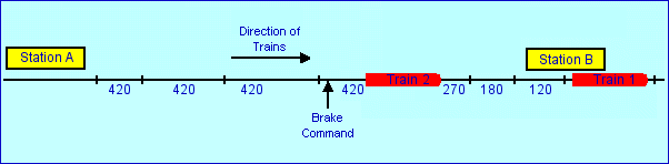 The 270 code has two special properties. First, it cancels the brake command on the train and second, it allows the train (Train 2 in our illustration) to run up to 25 mi/h as it runs into the station behind the departing Train 1. As Train 1 leaves, the codes will change to 270 allow Train 2 to remotor until the train has got part way into the platform, where the code will be 180 and the train will stop motoring. It will then brake to a stop using the station stopping commands.