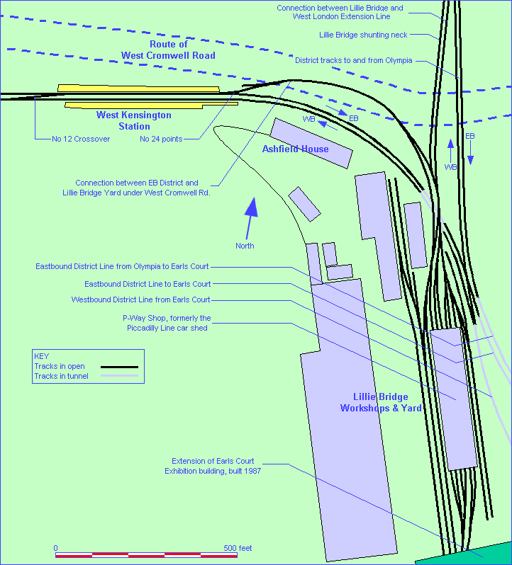diagram shows the connection between West Kensington EB track and the yard of Lillie