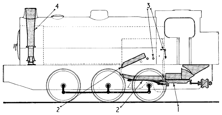 Diagram showing the four basic units of the system. 1-the underfeed stoker; 2-the gas producer system; 3-the "jet" system; 4-the blast-pipe arrangement