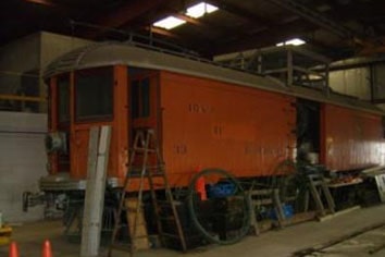 IATR 33 (former CNS&M merchandise car 234) sits in the shop. Although fitted for use as a linecar, IATR found it more practical to do overhead line work with a bucket truck. It is now at the Iowa Trolley Park in Clear Lake.