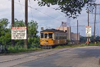 A 900-series leaves the west end of the viaduct. Note the warning signs for traffic. There never was an accident or mishap on the viaduct involving the interurbans or streetcars, but occasioanlly a drunk motorist would ignore the signs and get his car stuck on the ties.