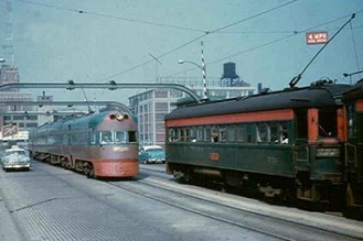 After leaving the Milwaukee station a southbound Electroliner meets a northbound train of standard cars on the 6th street viaduct. The 'Liners were the pride of the system, but the standard cars held down the majority of the runs.