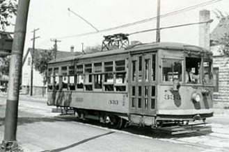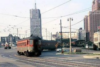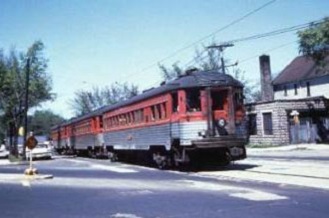 Unlike the 'Liners, the standard cars could be combined into trains of 2, 4, or 6 cars as needed. Except for very rare occasions, a six-car train was the limit due to the length of loading platforms. A train of standard cars heads south on 5th street at Chase Ave. Street running from 5th & Harrison brought the trains into downtown, but the slow tedious run among traffic added time to the schedules.